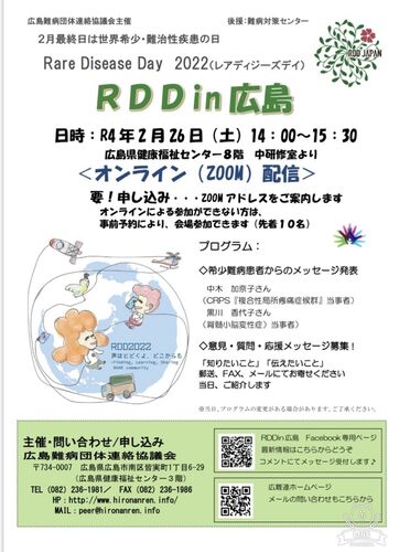 𖤣𖤥𖠿𖤣𖤥 2022/2/26 sat RDDin広島 RDDとは? 世界同一開催の世界希少・難治性疾患の日Rare Disease Day(レアディジーズデイ)の略です 希少・難治性疾患の病気に苦しむ人は世界中にいます。それにもかかわらず、患者数が少なく、病気のメカニズムが複雑なため、…